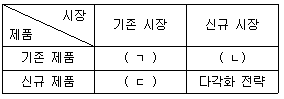 다음 Ansoff가 제시한 제품과 시장의 매트릭스 모델의 ()에 알맞은 것은?