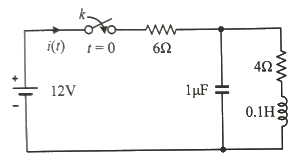 다음 회로의 스위치 k를 t = 0s에 닫았을 때 초기 전류 i(0+)는 몇 A 인가? (단, 모든 초기 값은 0 이다.)