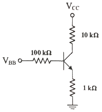 다음 회로에서 베이스 전류 IB는 얼마인가? (단, β=99, VBE=0.7V, VCC=20V, VBB=10.7V 이다.)