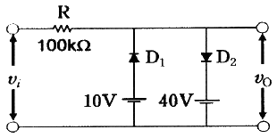 다음 회로에 vi=100sinwt의 입력이 가해질 경우 출력파형의 형태와 최대치 전압으로 가장 적합한 것은? (단, D1, D2는 이상적인 다이오드이다.)