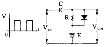 다음과 같은 클램프(Clamp)회로의 출력 파형으로 가장 적합한 것은? (단, 다이오드는 이상적이고, RC의 시정수는 대단히 크다.)