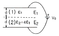 평행판 콘덴서의 극판 사이에 유전율이 각각 ε1, ε2인 두 유전체를 반씩 채우고 극판 사이에 일정한 전압을 걸어줄 때 매질 (1), (2) 내의 전계의 세기 E1, E2 사이에 성립하는 관계로 옳은 것은?
