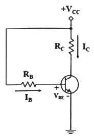 다음의 트랜지스터 회로에서 VCC가 10V, RB가 300kΩ이고 RC가 1kΩ일 때, 베이스전류 IB 컬렉터-이미터 전압 VCE로 옳은 것은? (단, VBE = 0.7V이고, β = 100 이다.)