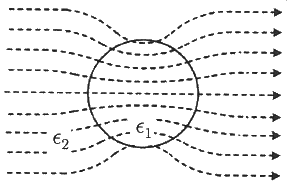 평등 전계 중에 유전체 구에 의한 전계 분포가 그림과 같이 되었을 때 ε1과 ε2의 크기 관계는?(문제 오류로 가답안 발표시 2번으로 발표되었지만 확정답안 발표시 모두 정답처리 되었습니다. 여기서는 가답안인 2번을 누르면 정답 처리 됩니다.)