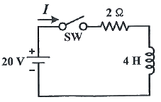 다음 회로에서 스위치(SW)를 충분한 시간동안 열어 놓았다가, 스위치(SW)를 닫고 2초 후에 회로에 흐르는 전류(I)는 약 몇 A 인가?