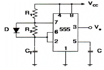 다음 그림과 같은 IC 555 타이머를 이용한 펄스발생회로에서 Vcc=5V, R1=10kΩ, R2=10kΩ, CT=0.02μF, C=0.01μF일 때, 출력파형의 펄스폭(τ)과 주파수(f)는 얼마인가?(단, 다이오드의 순방향 저항은 0으로 간주하고 ln2=0.7로 적용한다.)