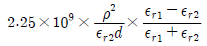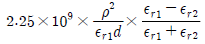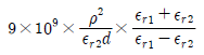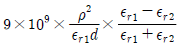 비유전율 εr1, εr2인 두 유전체가 나란히 무한평면으로 접하고 있고, 이 경계면에 평행으로 유전체의 비유전율 εr1내에 경계면으로부터 d(m)인 위치에 선전하 밀도 ρ(C/m)인 선상전하가 있을 때, 이 선전하와 유전체 εr2간의 단위 길이당의 작용력은 몇 N/m 인가?