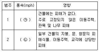 태풍에 관한 사피어-심슨(Saffir-Simpson) 스케일에서 ㉠, ㉡에 들어갈 내용은? (순서대로 ㉠, ㉡)
