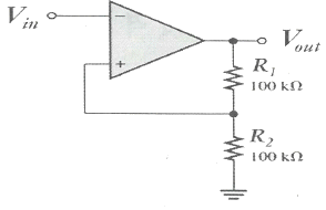 다음 연산증폭기를 이용한 비교기 회로에서 히스테리시스 전압(VHYS)은 몇 V 인가? (단, +Vout(max)는 +5V이고 –Vout(max)는 –5V이다.)