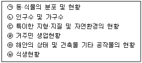 독도 등 도서지역의 생태계 보전에 관한 특별법령상 무인도서등의 자연생태계 등의 조사에 포함되어야 할 내용으로 가장 적합하게 나열된 것은? (단, 기타 자연생태계 등의 보전을 위하여 특히 조사할 필요가 있다고 환경부장관이 인정하는 사항은 제외한다.)