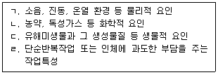 「농어업인 삶의 질 향상 및 농어촌지역 개발 촉진에 관한 특별법」상 농작업자 건강위해 요소의 측정 대상을 모두 나열한 것은?