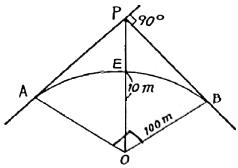 그림과 같이 곡선중점(E)을 E' 로 이동하여 교각의 변화 없이 새로운 곡선을 설치하고자 한다. 새로운 곡선의 반지름은?