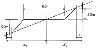 그림과 같이 경사지에 폭 6.0m의 도로를 만들고자 한다. 절토 기울기 1:0.7, 절토고 2.0m, 성토기울기 1:1, 성토고 5.0m일 때 필요한 용지폭(x1+x2)은? (단, 여유폭 a는 1.50m로 한다.)