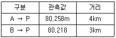 A, B 두 개의 수준점에서 P점을 관측한 결과가 표와 같을 때 P점의 최확값은?