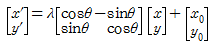 아래와 같이 주어진 수식이 의미하는 좌표변환은? (λ: 축척변환, (x0,y0): 원점의 변위량, θ: 회전변환, (x’,y’): 보정된 자표, (x,y): 보정 전 좌표)