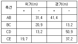 터널공사를 위한 트래버스 측량의 결과가 다음 표와 같을 때 직선 EA의 거리와 EA의 방위각은?