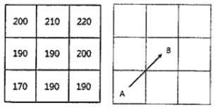 다음은 DEM데이터의 DN값이다. A→B방향의 경사도로 옳은 것은? (단, 셀의 크기는 100m×100m이다.)