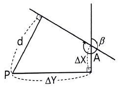 점 P에서 점 A를 지나며 방위각이 β인 직선까지의 수선장(d)을 구하는 식으로 옳은 것은?