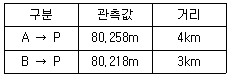 A, B 두 개의 수준점에서 P점을 관측한 결과가 표와 같을 때 P점의 최확값은?