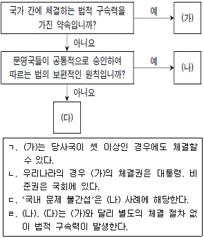 국제법의 법원 (가)∼(다)를 구분한 것이다. 이에 대해 옳은 설명만을 <보기>에서 모두 고른 것은? (단, (가)∼(다)는 각각 조약, 국제 관습법, 법의 일반 원칙 중 하나이다.)