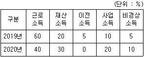 표는 어느 가계의 소득별 구성비 변화를 나타낸 것이다. 2019년 대비 2020년에 나타난 변화에 대한 설명으로 옳은 것은?