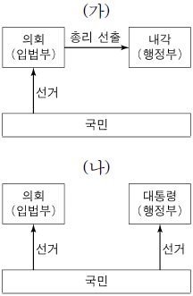 그림 (가), (나)는 전형적인 정부 형태를 나타낸 것이다. 이에 대한 설명으로 옳은 것은? (단, (가), (나)는 각각 대통령제와 의원 내각제 중 하나이다.)
