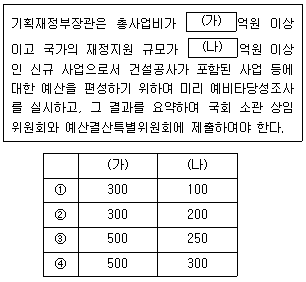 다음은 「국가재정법」상 예비타당성조사에 대한 내용이다. (가)와 (나)에 들어갈 숫자로 옳은 것은?