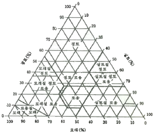 자갈 20%, 모래 25%, 실트 30%, 점토 25%인 토양을 아래 삼각자로 분류법에 의하면 어디에 해당하는가?