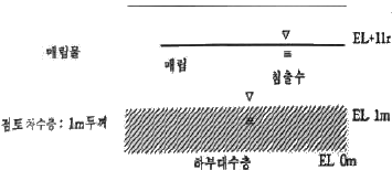 그림과 같이 매립지 저면은 두께가 1m인 점토차수층(Ilner) 으로 되어 있다. 침출수의 평균수두가 해발표고 11m이고, 점토차수층 하부에 분포된 대수층의 평균수두가 해발 1m이며 점토층의 유효 공극률은 0.2, 수직투수계수는 10-7cm/sec일 때 침출수가 점토차수층을 통과하는데 소요되는 시간(day)은? (단, 침출수는 점토 차수층과 반응을 하지 않는다고 가정)