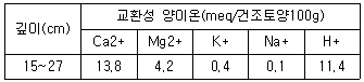 다음 표는 특정 깊이(15~27cm)에서 교환성 양이온의 농도를 측정한 결과이다. 이를 바탕으로 구한 토양의 수소 및 염기포화도(%)는?
