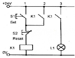 다음 회로도는 자기유지(메모리블록) 회로도를 IEC 심벌기호로 표시한 것이다. 다음 중에서 회로도의 입력 신호와 출력신호 관계를 틀리게 설명한 것은?