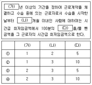 최저임금법령상 수습 중에 있는 근로자(단순 노무업무로 고용노동부장관이 정하여 고시한 직종에 종사하는 근로자는 제외)에 대한 최저임금액의 내용이다. (가)~(다)에 들어갈 내용을 바르게 연결한 것은?
