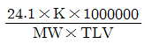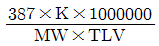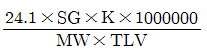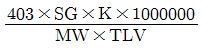 전체환기에서 오염물질 사용량(L)DP 대한 필요환기량(m3/L)을 산출하는 공식은? (단, SG : 비중, K : 안전계수, MW : 분자량, 싶 : 노출기준이다.)