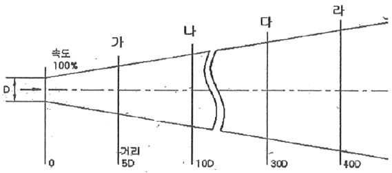그림과 같이 노즐(Nozzle) 분사구 개구면의 유속을 100%라 하고 분사구 내경을 D라고 할 때 분서구 개구면의 유속이 50%로 감소되는 지점의 거리는?