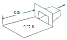 그림과 같이 작업대 위의 용접 흄을 제거하기 위해 작업면 위에 플랜지가 붙은 외부식 후드를 설치했다. 개구면에서 포착점까지의 거리는 0.3m, 제어속도는 0.5m/s, 후드개구의 면적이 0.6m2일 때 Della Valle식을 이용한 필요 송풍량(m3/min)은 약 얼마인가? (단, 후드개구의 폭/높이는 0.2보다 크다.)
