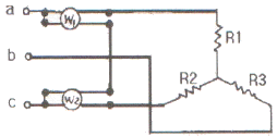 그림과 같이 단상전력계 W1 , W2 의 지시값이 각각 100[W]라면 전 소비전력은?
