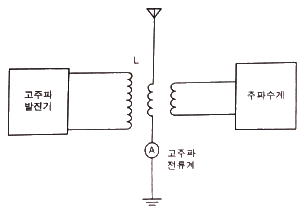 다음은 안테나의 고유 주파수를 측정하기 위한 회로이다. 고주파 전류계(A)의 지시값 및 고주파 발진기와 안테나 사이의 코일(L)의 결합은 어떻게 되는 것이 좋은가?
