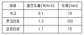 다음과 같이 구성된 구조체에서 1m2당 관류열량은? (단, 실내온도 25°C, 외기온도 10°C, 내표면 열전달률 8W/m2, 외표면 열전달률 20W/m2∙K 이다.)