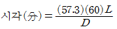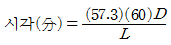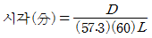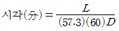시각(표적세부의 대각)의 측정공식으로 옳은 것은? (단, L은 시선과 직각으로 측정한 물체크기, D는 물체와 눈 사이의 거리이고, 57.3과 60은 시각이 600분 이하일 때, 라디안(radian) 단위를 분으로 환산하기 위한 상수이다.)