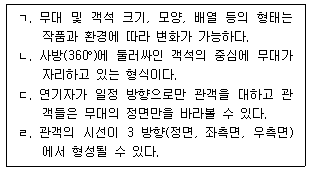 공연장 무대와 객석의 평면 형식과 그에 대한 특징을 바르게 연결한 것은?