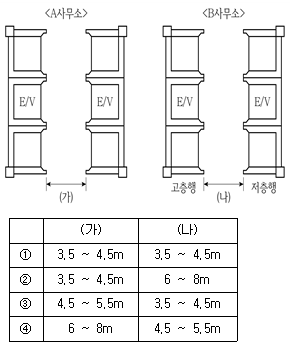 고층 사무소에 엘리베이터 6대를 대면배치하고자 한다. A사무소는 고층행, 저층행 구분 없이 한 그룹으로 운영하고 B사무소는 한쪽은 고층행, 한쪽은 저층행의 두 그룹으로 운영할 경우, 각 사무소의 엘리베이터 대면거리를 가장 바르게 연결한 것은? (다음 그림은 엘리베이터 평면도임)