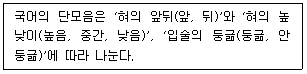 <보기>의 조건에 따라서 국어의 단모음을 나눈다면 가장 맞지 않는 것은?