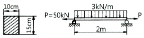 그림과 같은 직사각형 단면을 갖는 단순지지보에 3kN/m의 균일 분포하중과 축방향으로 50kN의 인장력이 작용할 때 단면에 발생하는 최대 인장 응력은 약 몇 MPa인가?