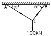 그림과 같이 강선이 천정에 매달려 100kN의 무게를 지탱하고 있을 때, AC 강선이 받고 있는 힘은 약 몇 kN 인가?