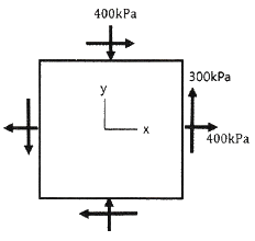 그림과 같이 평면응력 조건하에 최대 주응력은 몇 kPa 인가? (단, σx = 400kPa, σy = -400kPa, τxy = 300kPa 이다.)