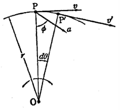 다음 그림에서 OP가 정지상태에서 출발하여 O를 중심으로 하여 각 가속도 10rad/s2으로 화살표 방향으로 회전했을 때, 0.6초 후의 P점의 속도(v′)는 약 몇 cm/s인가? (단, 의 길이는 20cm이다.)
