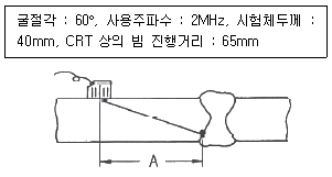 그림과 같이 용접부를 경사각 탐촉자로 검사하여 결함을 검출하였다. 탐촉자-결함거리 A는 약 얼마인가?
