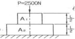 그림과 같이 길이가 동일한 2개의 기둥 상단에 중심 압축 하중 2500N이 작용할 경우 전체 수축량은 약 몇 mm인가? (단, 단면적 A1= 1000mm2, A2= 2000mm2, 길이 L=300mm, 재료의 탄성계수 E= 90GPa 이다.)