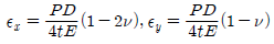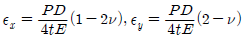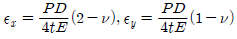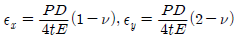 원통형 압력용기에 내압 P가 작용할 때, 원통부에 발생하는 축 방향의 변형률 εx 및 원주 방향 변형률 εy는? (단, 강판의 두께 t는 원통의 지름 D에 비하여 충분히 작고, 강판 재료의 탄성계수 및 포아송 비는 각 E,v이다.)