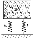 무게 20 N인 물체가 2개의 용수철에 의하여 그림과 같이 놓여 있다. 한 용수철은 1cm 늘어나는데 1.7 N이 필요하며 다른 용수철은 1 cm 늘어나는데 1.3 N이 필요하다. 변위 진폭이 1.25 cm가 되려면 정적 평형 위치에 있는 물체는 약 얼마의 초기속도(cm/s)를 주어야 하는가? (단, 이 물체는 수직 운동만 한다고 가정한다.)
